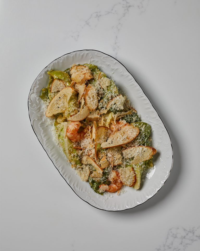 Romano,parmesan,krevetlər,çörək cipsləri,ançous sousu