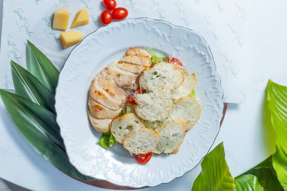 Romano,parmesan,toyuq,çörək cipsləri,ançous sousu