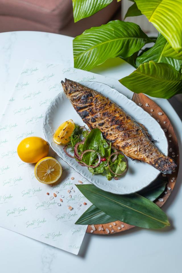 Qızıl balıq/Batat püre ile/ Şpinat göbələk