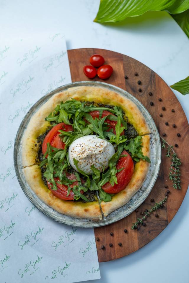 Buratta / Marinə olunmuş pomidor / pesto sousu ilə