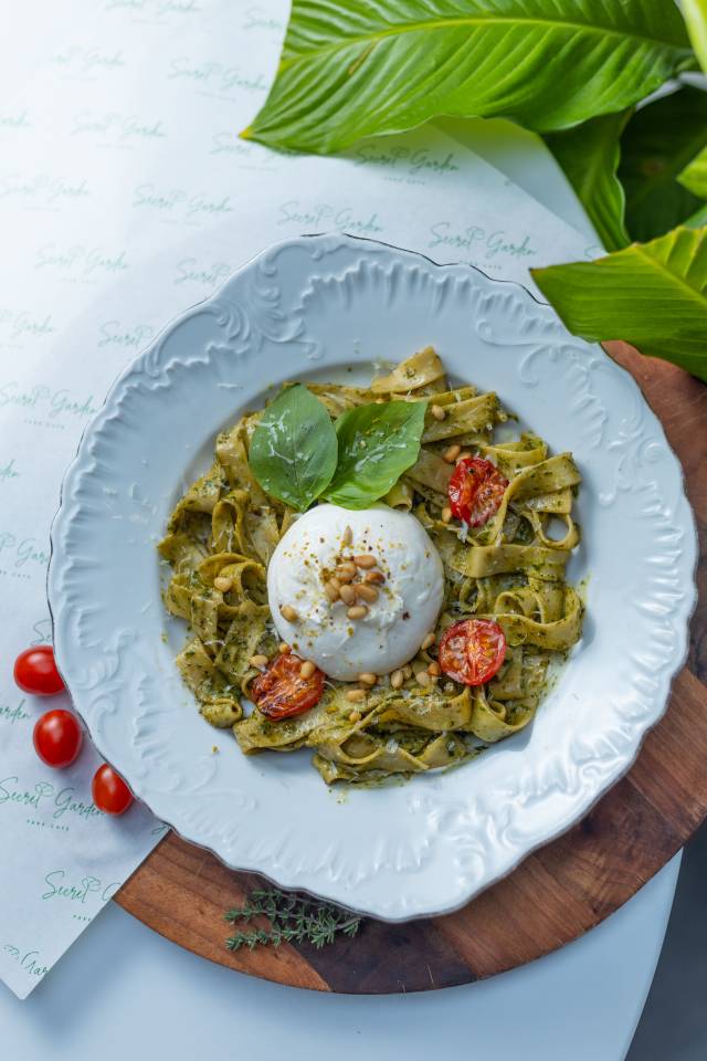 Spagetti krevet ilə / Pesto sousu / stracciatella