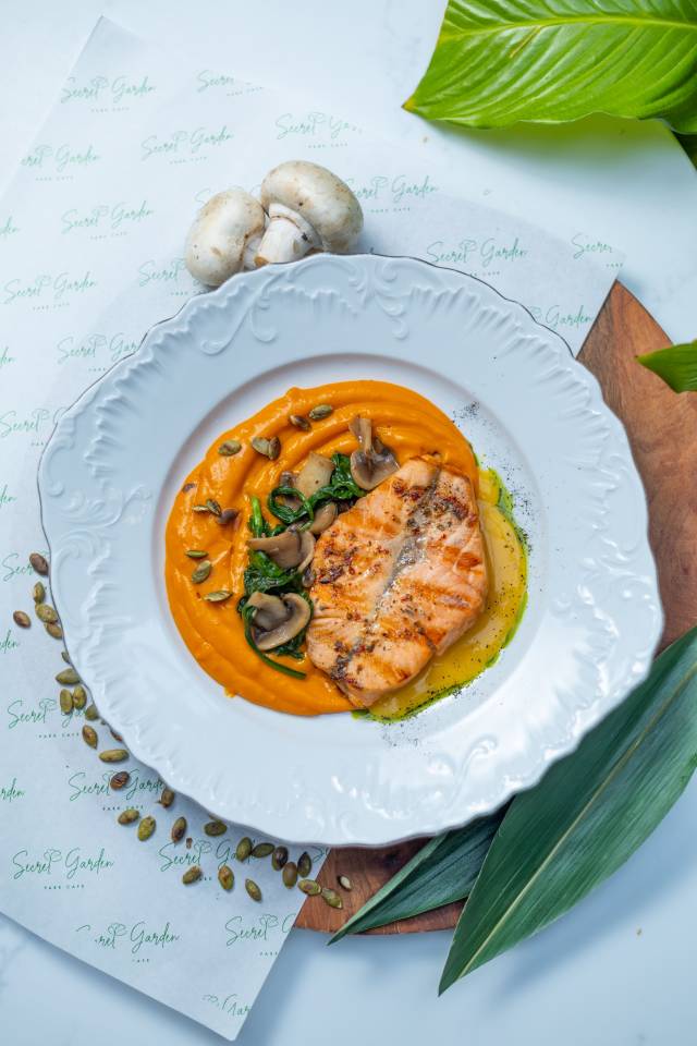 Qızıl balıq/Batat püre ile/ Şpinat göbələk