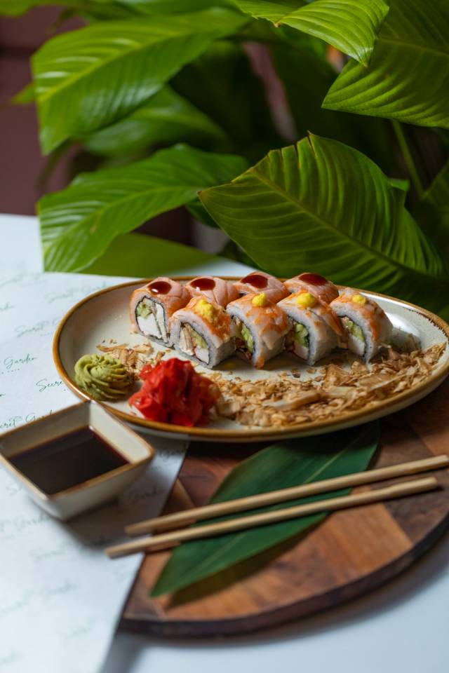 Düyü, nori, krem pendir, xiyar, avokado, çiy qızılbalıq, Yapon mayonezi, panko, unagi sousu, küncüt toxumu.