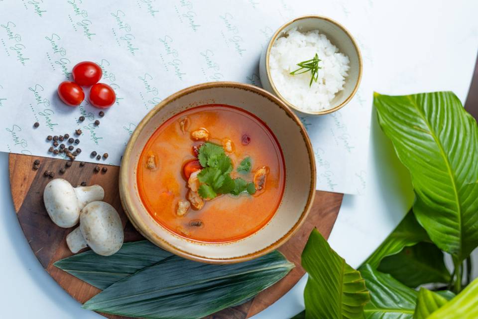 şüyüd, keşniş, reyhan, rukkola, romaine kahı, çerri pomidorları, popkorn sousu,тoyuq
