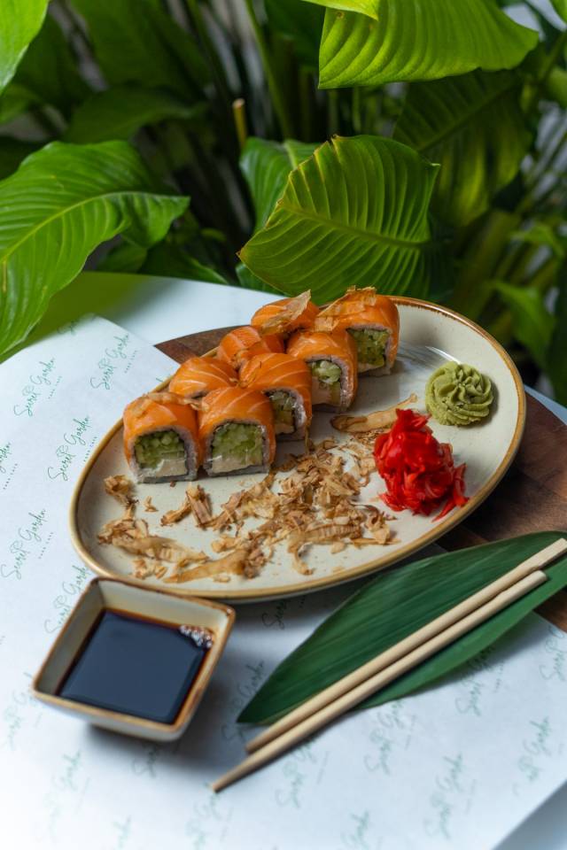 Düyü, krem pendir, xiyar, avokado, çiy qızılbalıq, krevet, nori, unagi sousu, manqo sousu, küncüt toxumu.